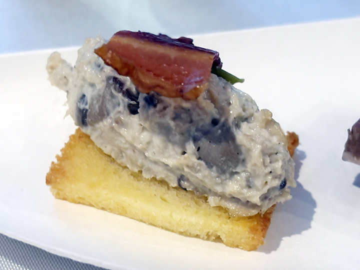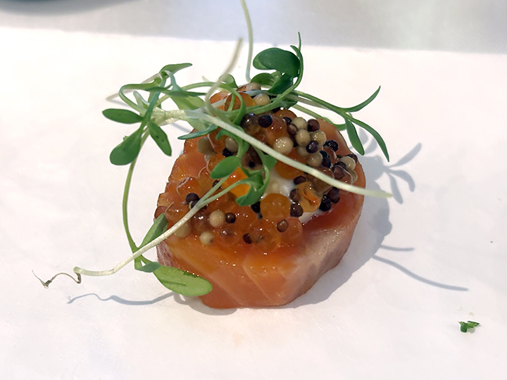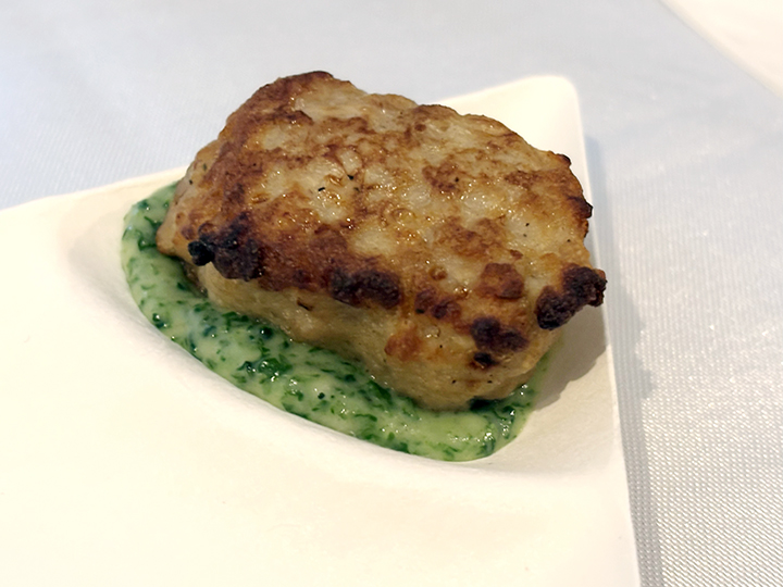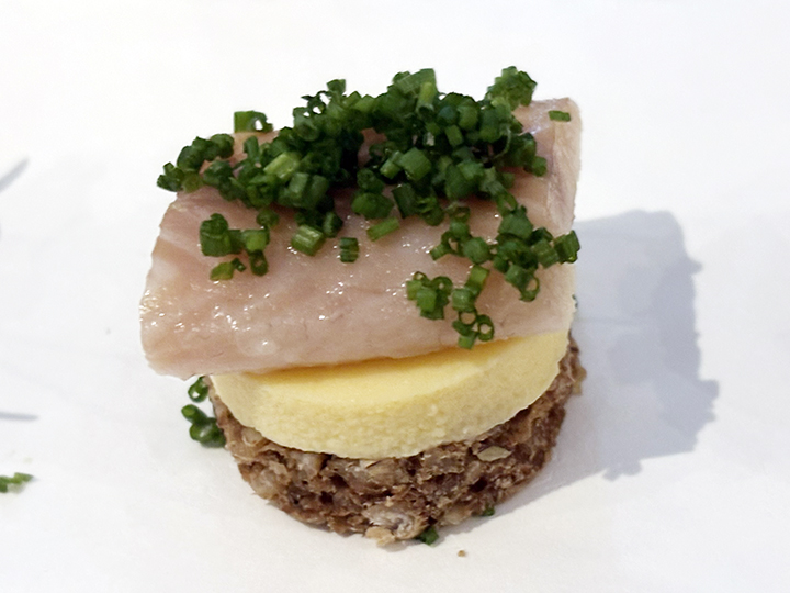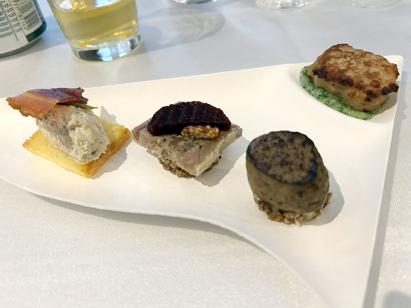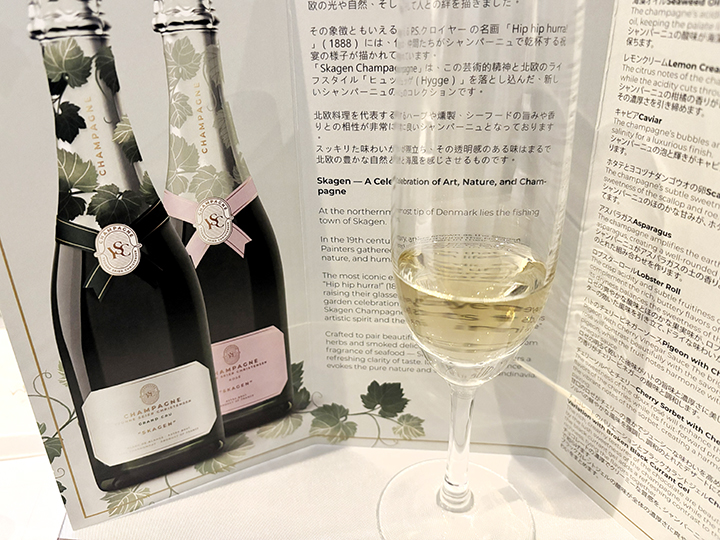 まずは、北欧発祥の蒸留酒アクアビットで乾杯。チェイサーはカールスバーグです。フィンガーフードのニシンの前菜3品から始まり、様々な調理法の魚料理が5品、続いて鶏肉や豚肉、ピクルスとケールソースのミートボールといった肉の4品が出そろいました。途中、北欧料理との相性の良い、日本未入荷のシャンパーニュ「Skagen Champagne」の紹介もありました。