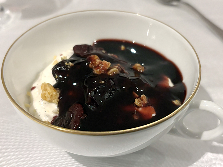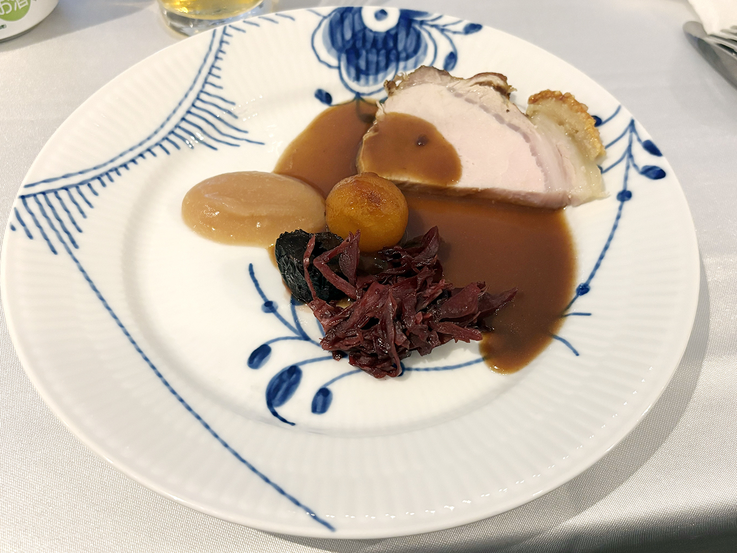 メインディッシュは、デンマーク風豚のローストです。カリッカリに焼いた豚肉の皮とポートワインで煮込んだプルーンのグラッセ、小さなブラウンポテト、ソース添え。デザートにはデンマーク風ライスプディングのリゼラモンにチェリーのシャーベット、ドライチェリー、アーモンドクランブル、そしてたっぷりのチェリーソース。最後に古くからデンマークの冬に広く食べられているお菓子、クレイナーが配られました。