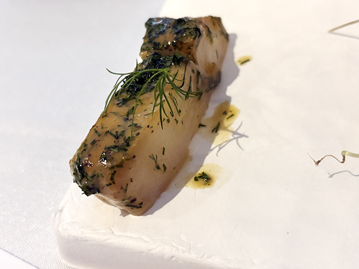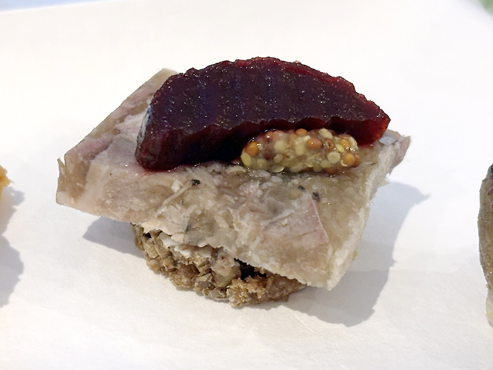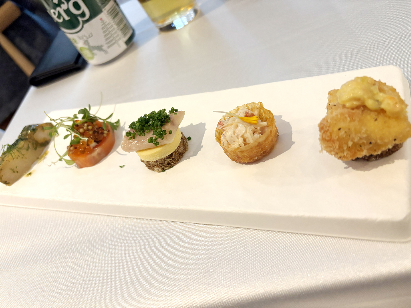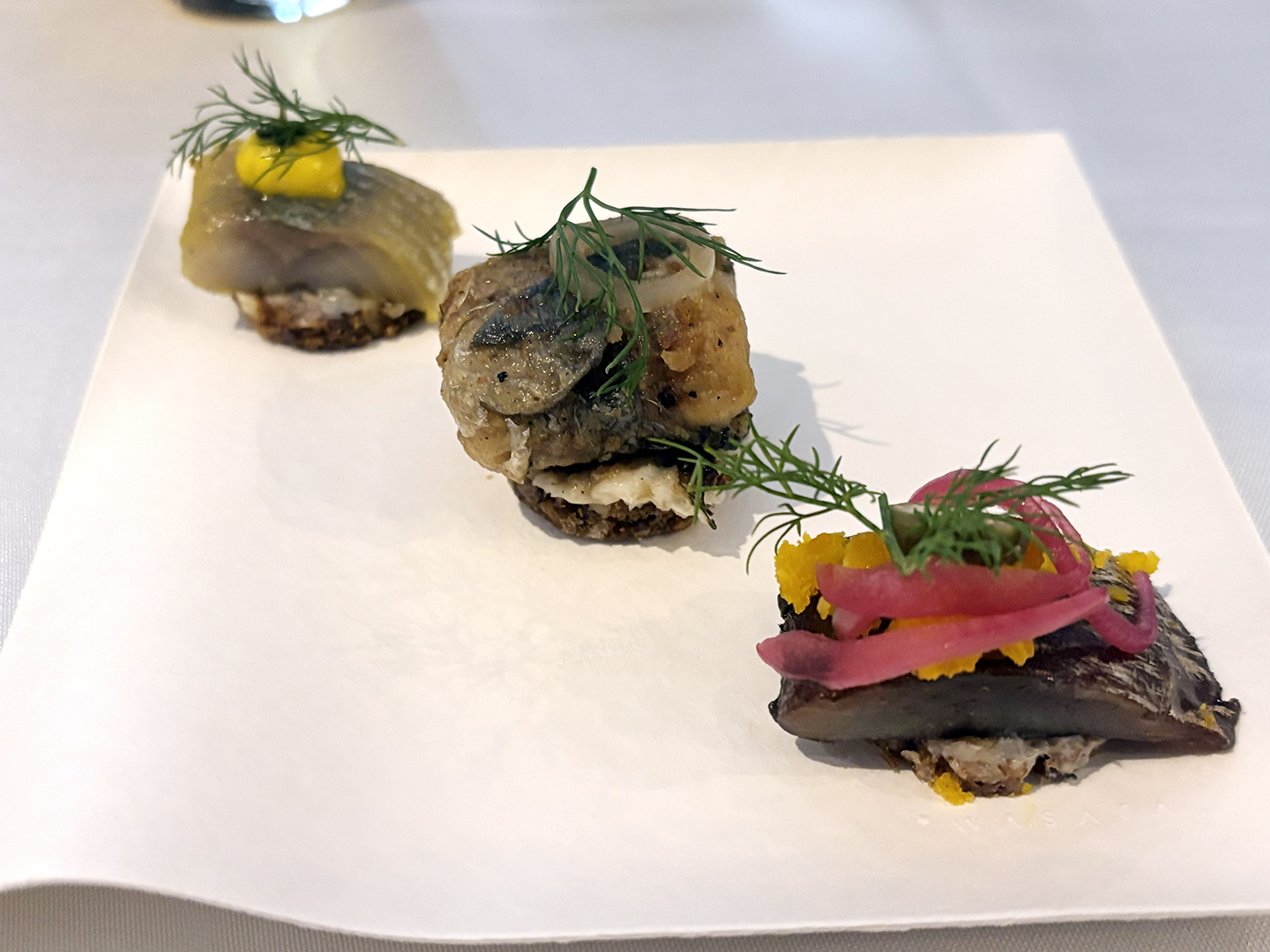 まずは、北欧発祥の蒸留酒アクアビットで乾杯。チェイサーはカールスバーグです。フィンガーフードのニシンの前菜3品から始まり、様々な調理法の魚料理が5品、続いて鶏肉や豚肉、ピクルスとケールソースのミートボールといった肉の4品が出そろいました。途中、北欧料理との相性の良い、日本未入荷のシャンパーニュ「Skagen Champagne」の紹介もありました。