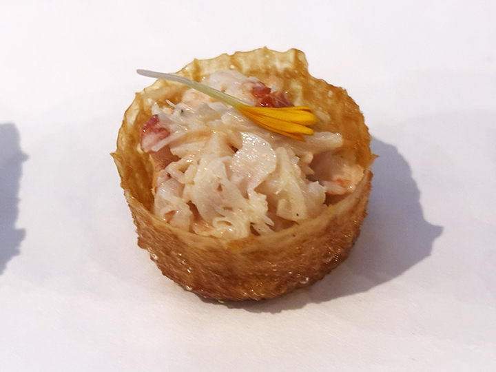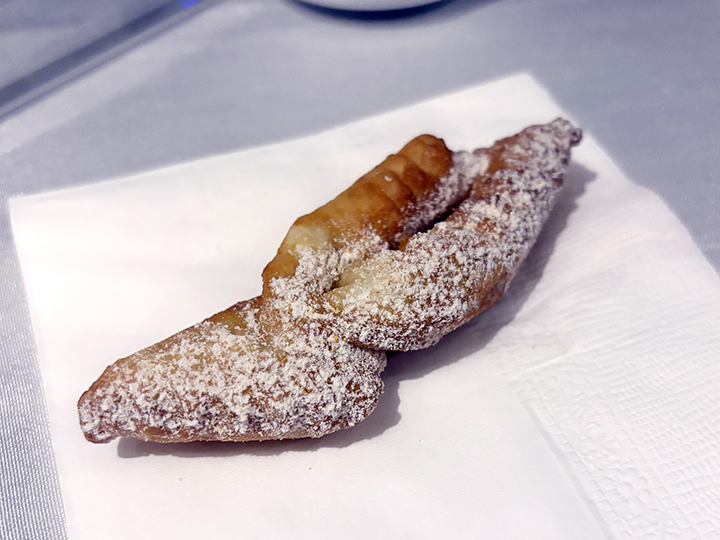 メインディッシュは、デンマーク風豚のローストです。カリッカリに焼いた豚肉の皮とポートワインで煮込んだプルーンのグラッセ、小さなブラウンポテト、ソース添え。デザートにはデンマーク風ライスプディングのリゼラモンにチェリーのシャーベット、ドライチェリー、アーモンドクランブル、そしてたっぷりのチェリーソース。最後に古くからデンマークの冬に広く食べられているお菓子、クレイナーが配られました。